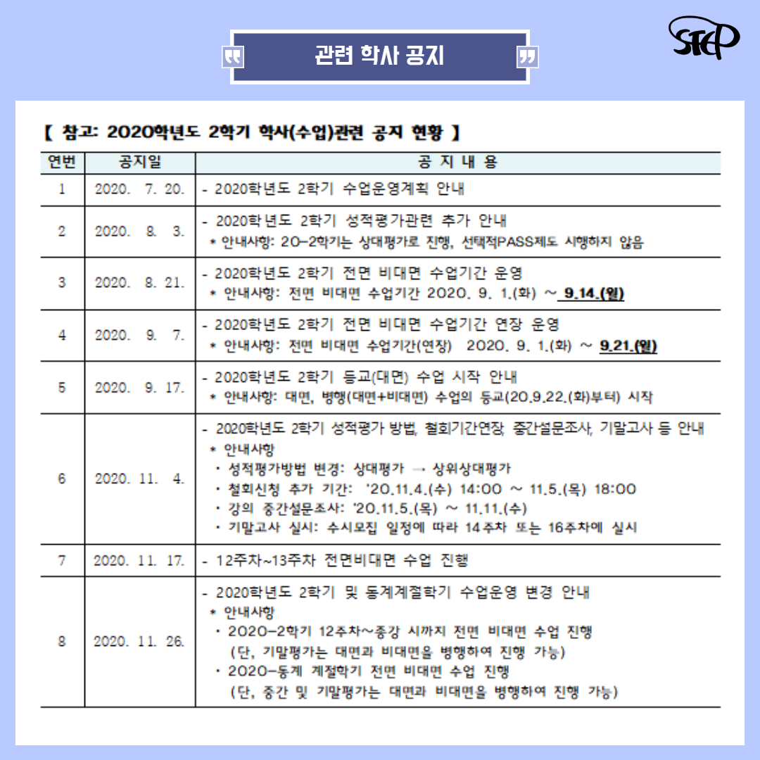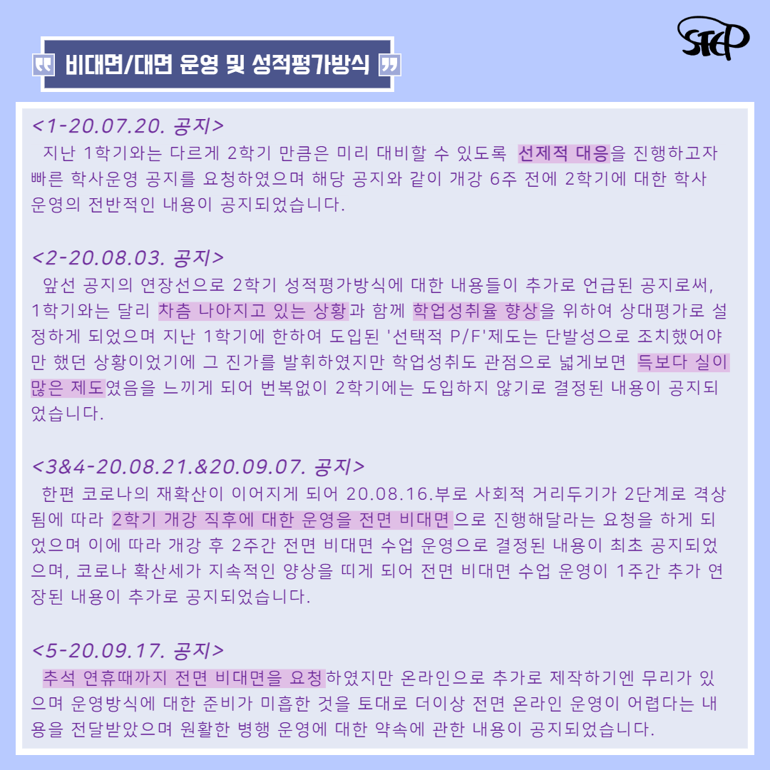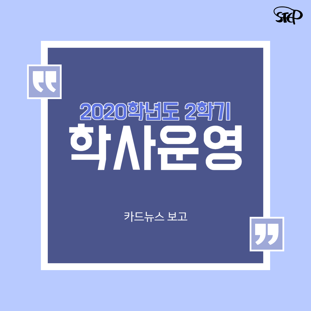[학사운영관련 카드뉴스&학생총설문조사 안내] 안녕하세요 학우 여러분, 제36대 STEP 총학생회 입니다. 더불어, 2020학년도의 경우 학생총회를 원활히 진행할 수 없는 상황임에 따라, 비단 코로나와 관련한 내용만이 아닌 학사와 관련한 전반적인 의제들이 담긴 '학생총설문조사'를 진행하게 되었습니다. 상기 링크를 통해 학우 여러분의 다양한 의견을 구글 폼에 작성하여 주시면 감사드리겠습니다. STEP 총학생회는 임기를 약 4주 남겨놓고 있습니다. 저희 총학생회는 임기와 무관하게 현재 진행형인 코로나19로부터 학우 여러분의 안전을 보장받을 수 있도록 지속적으로 노력하고 있습니다. 감사합니다. 한데 모인 이야기로 나아가는 제36대 STEP 총학생회  |