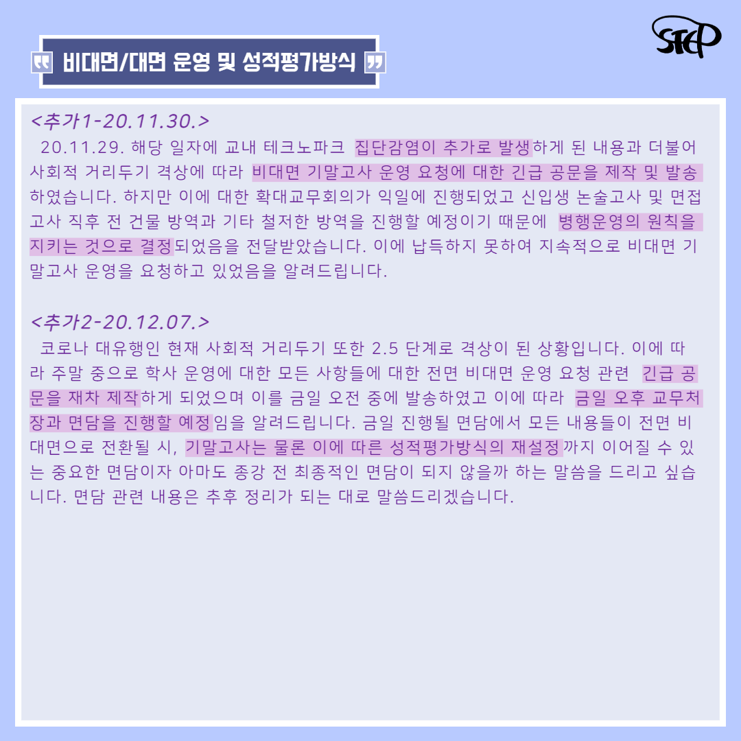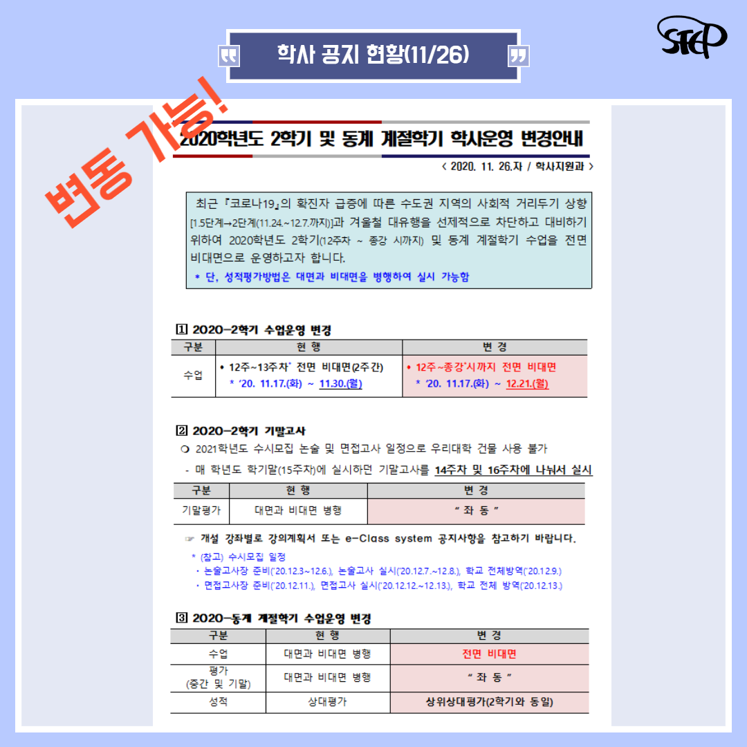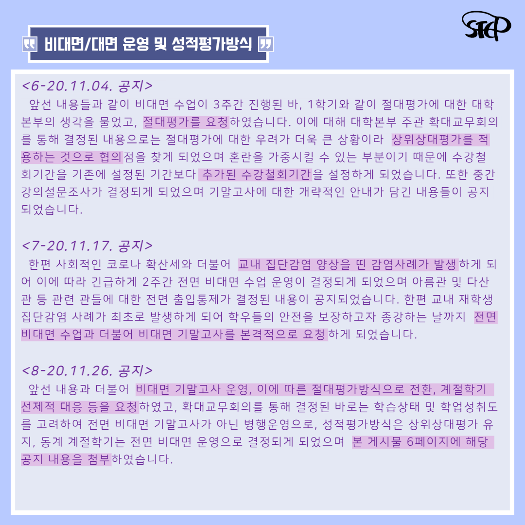 [학사운영관련 카드뉴스&학생총설문조사 안내] 안녕하세요 학우 여러분, 제36대 STEP 총학생회 입니다. 더불어, 2020학년도의 경우 학생총회를 원활히 진행할 수 없는 상황임에 따라, 비단 코로나와 관련한 내용만이 아닌 학사와 관련한 전반적인 의제들이 담긴 '학생총설문조사'를 진행하게 되었습니다. 상기 링크를 통해 학우 여러분의 다양한 의견을 구글 폼에 작성하여 주시면 감사드리겠습니다. STEP 총학생회는 임기를 약 4주 남겨놓고 있습니다. 저희 총학생회는 임기와 무관하게 현재 진행형인 코로나19로부터 학우 여러분의 안전을 보장받을 수 있도록 지속적으로 노력하고 있습니다. 감사합니다. 한데 모인 이야기로 나아가는 제36대 STEP 총학생회  |
