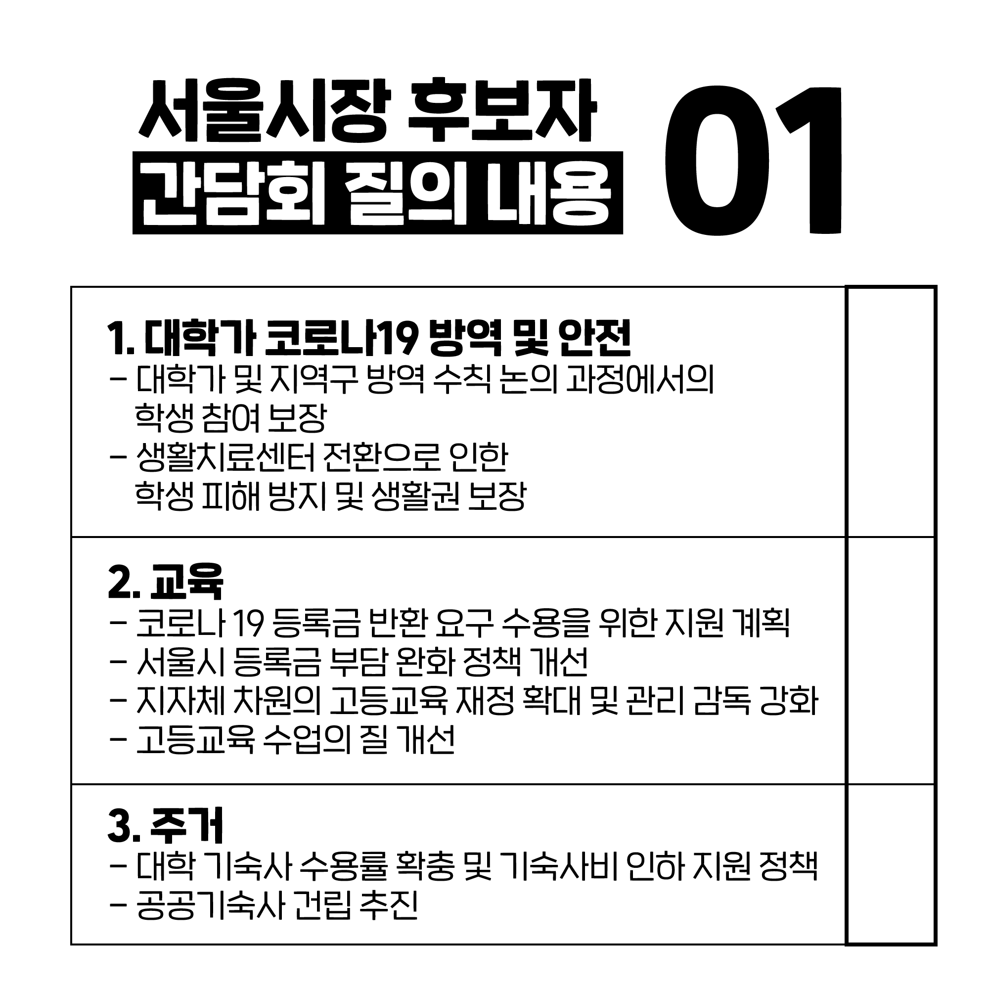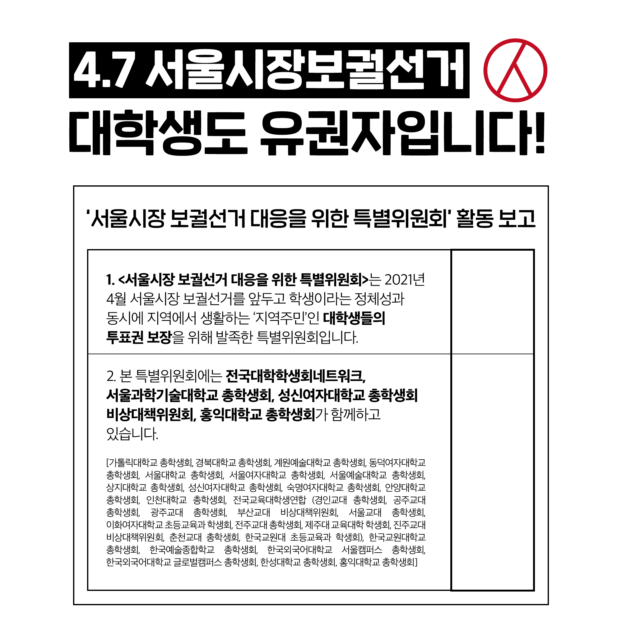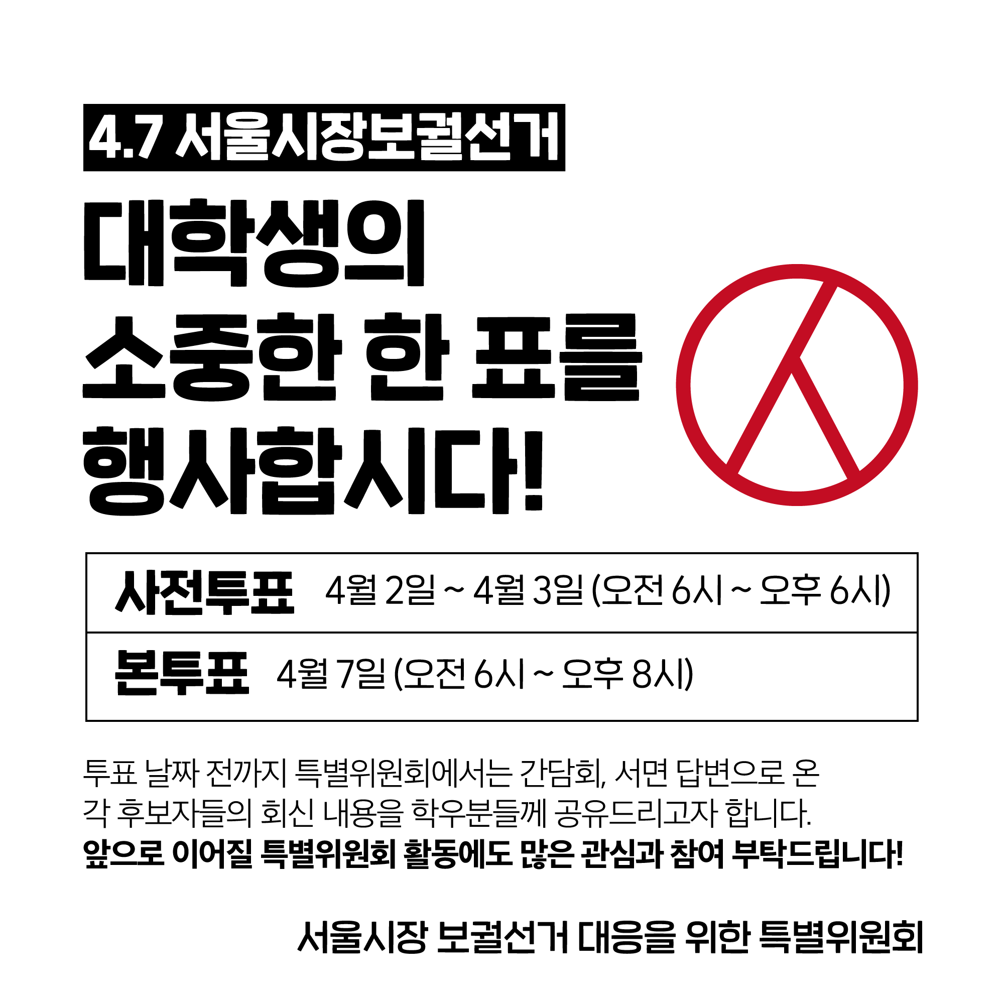| 제목 | 4.7 서울시장 보궐선거: 대학생도 유권자입니다! | 날짜 | 2021-03-30 | 조회수 | 921 |