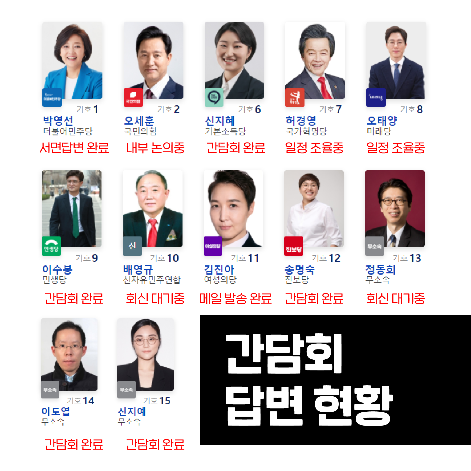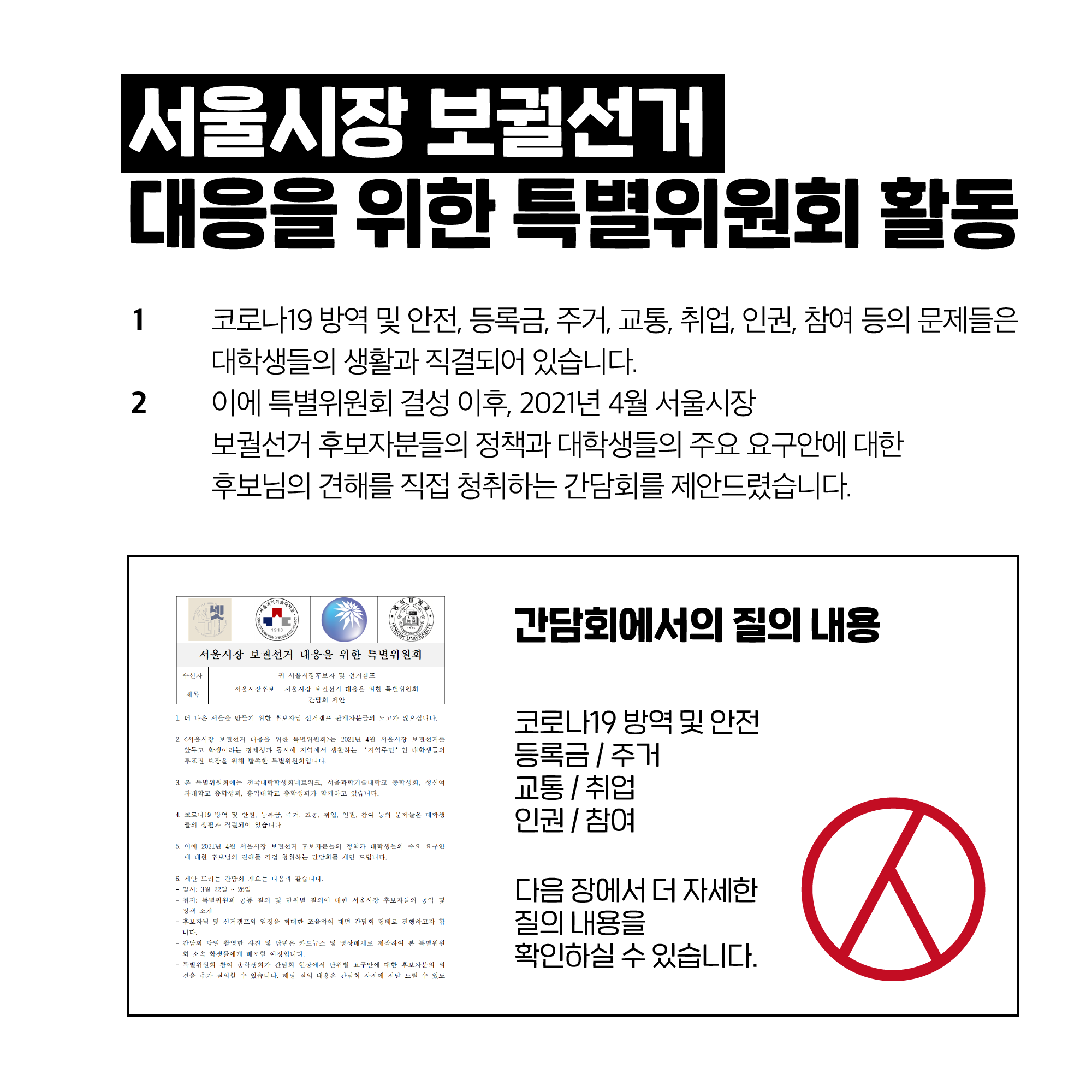 [4.7 서울시장 보궐선거: 대학생도 유권자입니다!] 안녕하세요, 제37대 Be:ST 총학생회입니다. 현재 총학생회는 우리대학 학우들의 서울시민으로서의 권리 보장을 위해 '서울시장 보궐선거 대응을 위한 특별위원회'에 참여하여 활동하고 있습니다. 얼마 남지 않은 보궐선거까지 학우 여러분의 많은 관심 부탁드립니다. 감사합니다. - '서울시장 보궐선거 대응을 위한 특별위원회' 활동 보고 1. <서울시장 보궐선거 대응을 위한 특별위원회>는 2021년 4월 서울시장 보궐선거를 앞두고 학생이라는 정체성과 동시에 지역에서 생활하는 ‘지역주민’인 대학생들의 투표권 보장을 위해 발족한 특별위원회입니다. 2. 본 특별위원회에는 전국대학학생회네트워크, 서울과학기술대학교 총학생회, 성신여자대학교 총학생회 비상대책위원회, 홍익대학교 총학생회가 함께하고 있습니다. 3. 코로나19 방역 및 안전, 등록금, 주거, 교통, 취업, 인권, 참여 등의 문제들은 대학생들의 생활과 직결되어 있습니다. 이에 특별위원회에서는 2021년 4월 서울시장 보궐선거 후보자분들의 정책과 대학생들의 주요 요구안에 대한 견해를 직접 청취하는 간담회를 제안드렸습니다. 4. 간담회 질의내용 5. 후보들의 회신 현황은 사진을 참고 부탁드립니다. 6. 4.7 서울시장보궐선거, 대학생의 소중한 한 표를 행사합시다! 사전투표: 4월 2일 ~ 4월 3일 (오전 6시 ~ 오후 6시) 투표날짜 전까지 특별위원회에서는 간담회, 서면 답변으로 온 각 후보자들의 회신 내용을 학우분들께 공유드리고자 합니다. 앞으로 이어질 특별위원회 활동에도 많은 관심과 참여 부탁드립니다! - 서울시장 보궐선거 대응을 위한 특별위원회 - ?가장 우리다운 길로 나아가는 Be:ST 총학생회? |