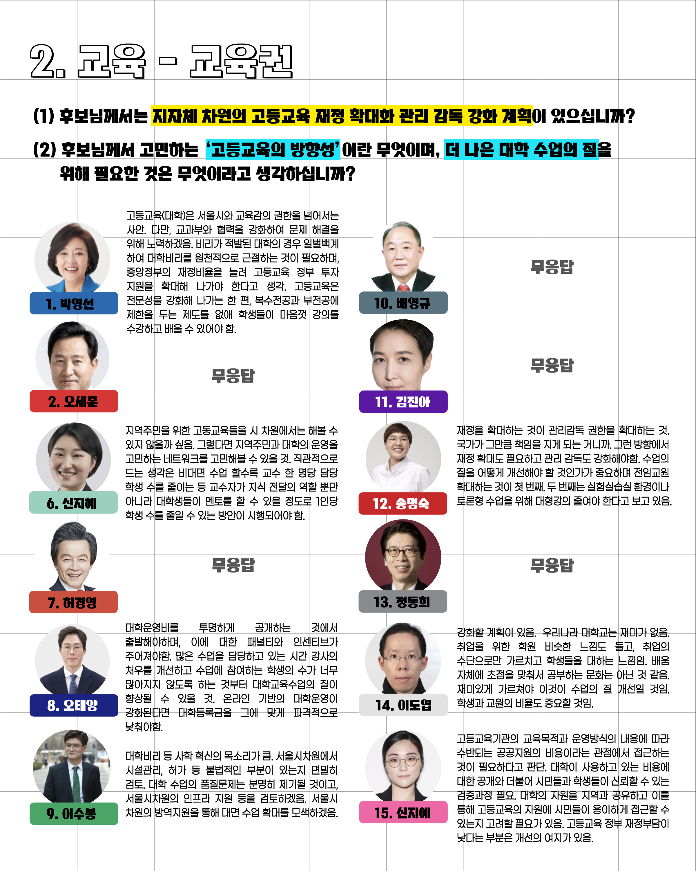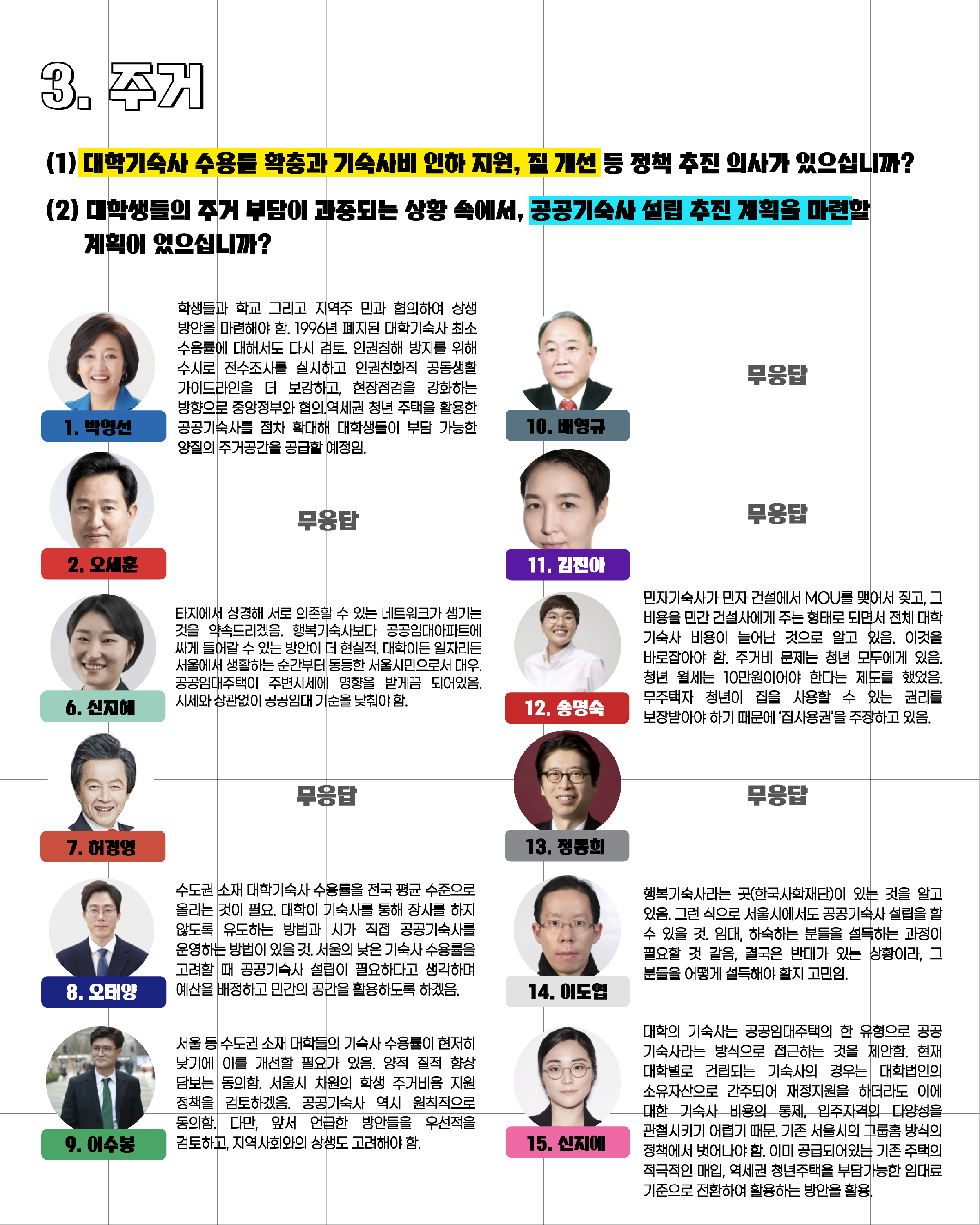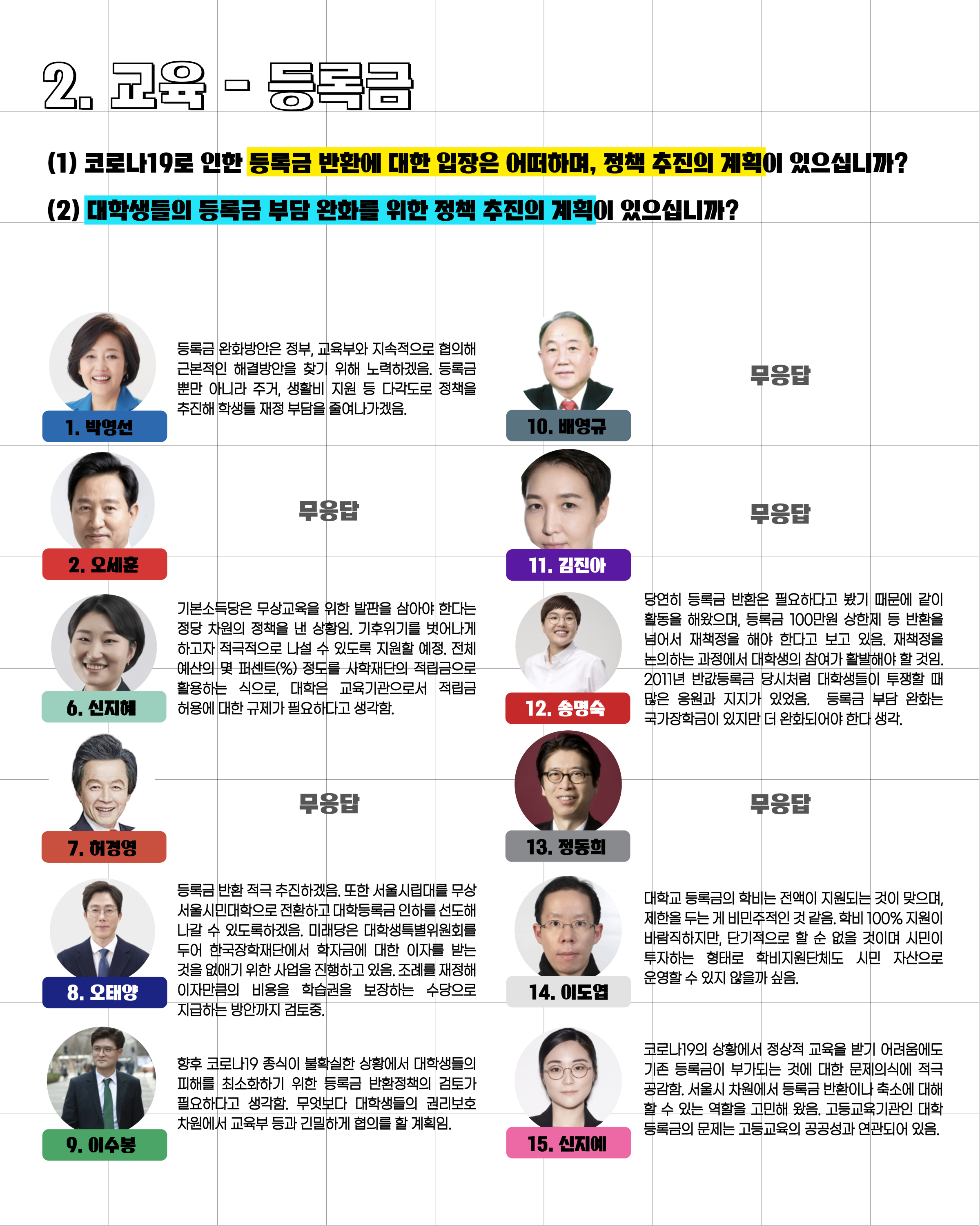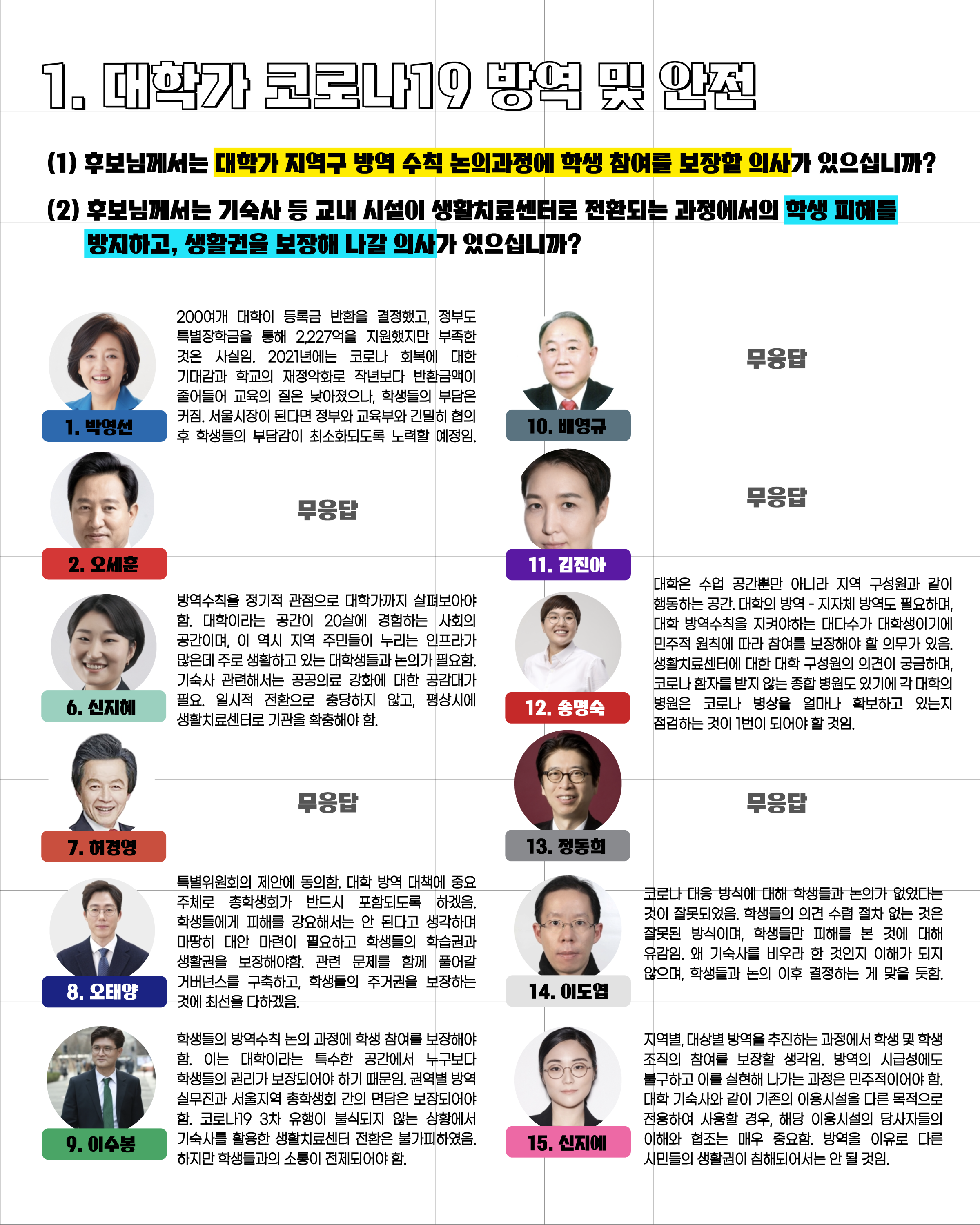 안녕하세요, 서울과학기술대학교 제37대 Be:ST 총학생회입니다. 오늘부터 서울시장 보궐선거 사전 투표가 실시됩니다. 학우 여러분이 후보자를 더 잘 알고 신중하게 투표권을 행사할 수 있도록, Be:ST 총학생회가 참여한 <서울시장 보궐선거 대응을 위한 특별위원회>에서 그간 진행한 후보자 간담회 내용을 카드뉴스로 전달해드립니다. <서울시장보궐선거 대응을 위한 특별위원회는 지난 3월 3주차부터 4월 1주차까지 15인의 서울시장 후보자들과의 간담회와 서면인터뷰를 진행하였습니다. 4월 1일 기준 7명의 후보자가 회신을 했으며, 서면 답변 및 간담회 내용을 기준으로 인터뷰 결과를 공유드립니다! ?서면답변확인>> http://bit.ly/서울시장후보자_서면답변 ?카드뉴스 내용 본문 ?4.7 서울시장보궐선거, 대학생의 소중한 한 표를 행사합시다! - 서울시장 보궐선거 대응을 위한 특별위원회 (전국대학학생회네트워크, 서울과학기술대학교 총학생회, 성신여자대학교 총학생회 비상대책위원회, 홍익대학교 서울캠퍼스 총학생회) -