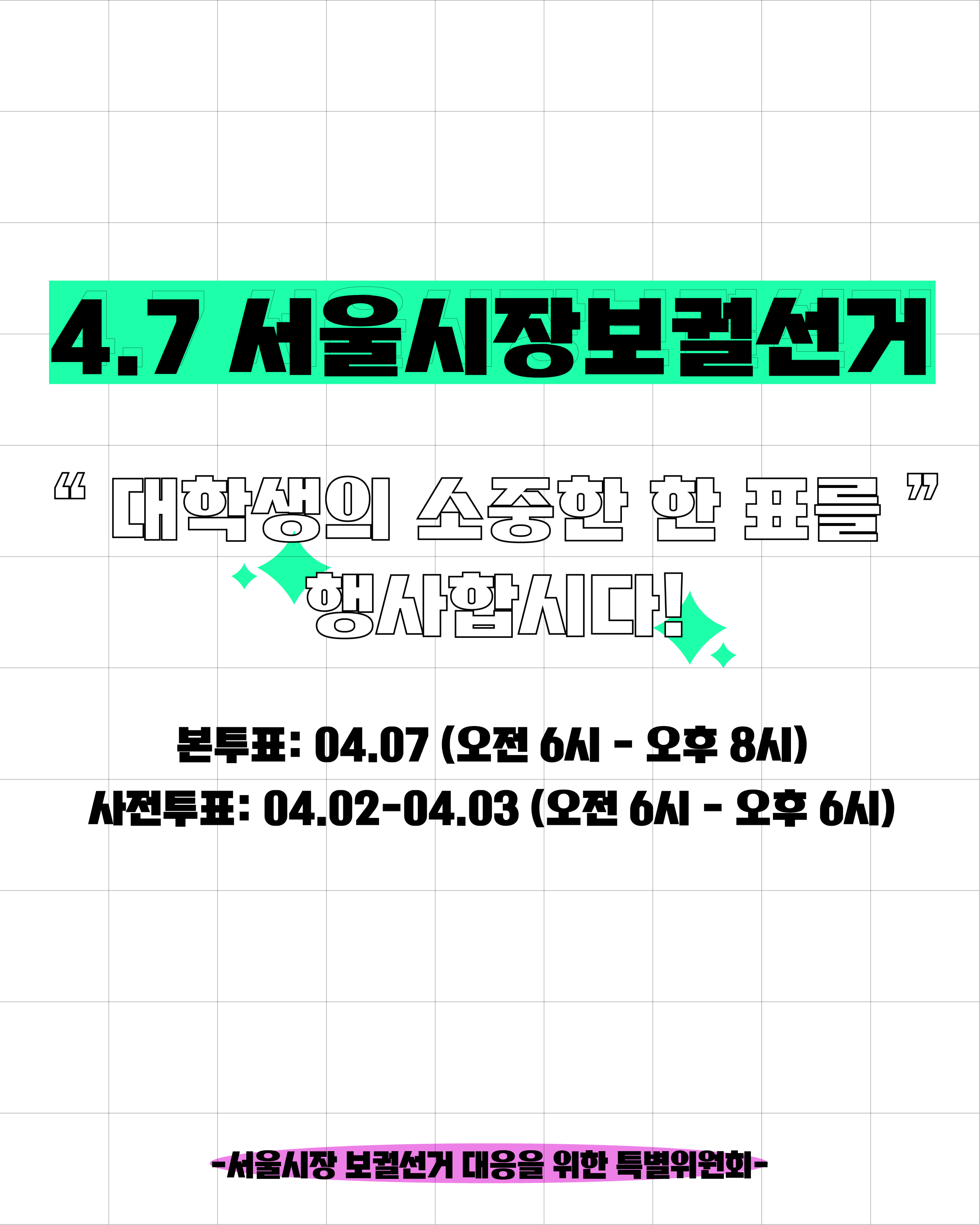 | 제목 | 4.7 서울시장보궐선거, 대학생도 유권자입니다! <2-1탄> | 날짜 | 2021-04-02 | 조회수 | 904 |