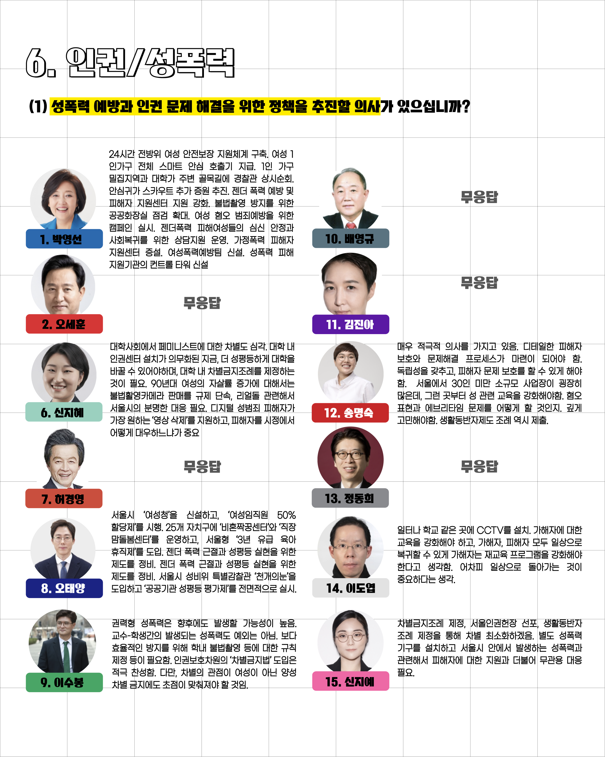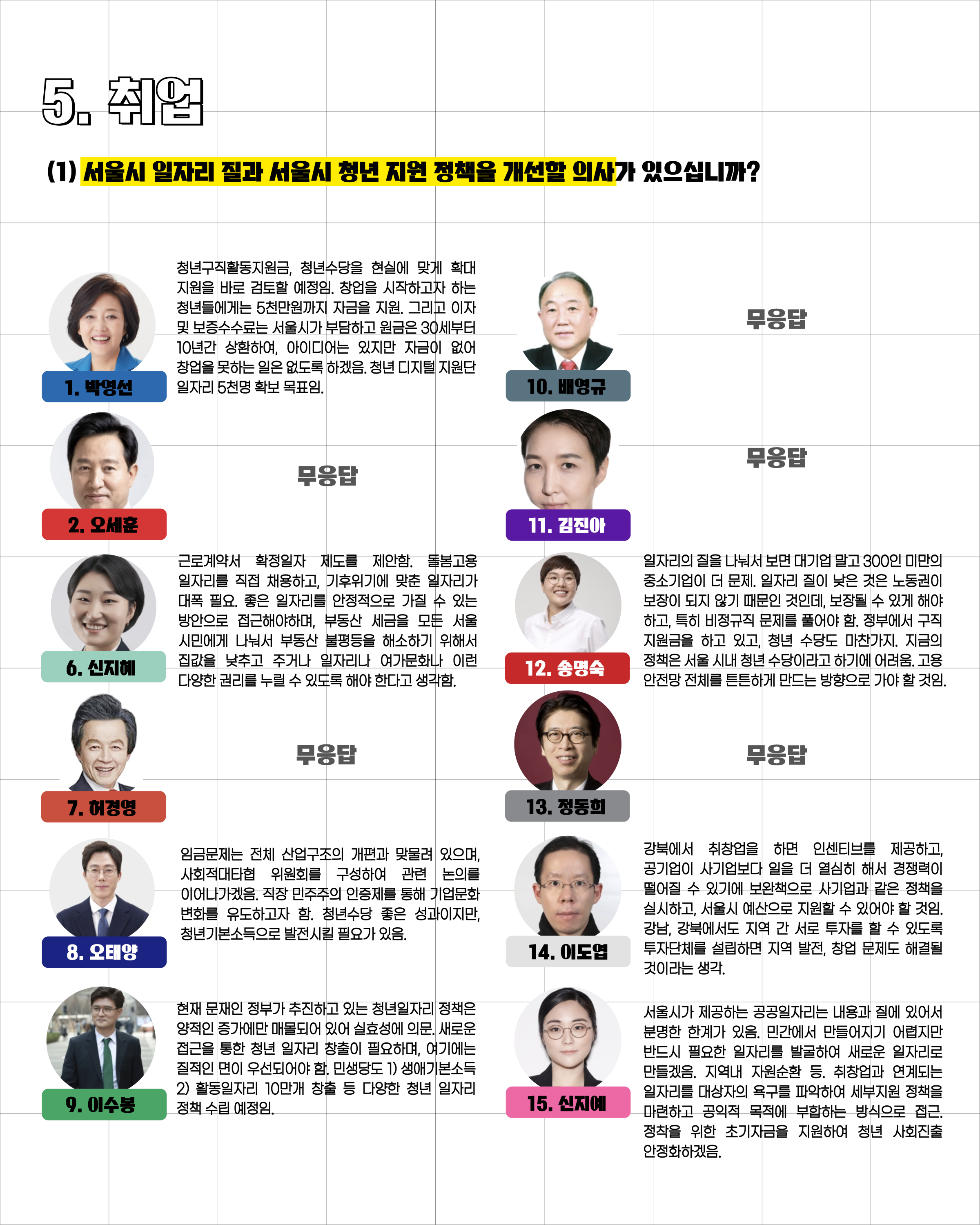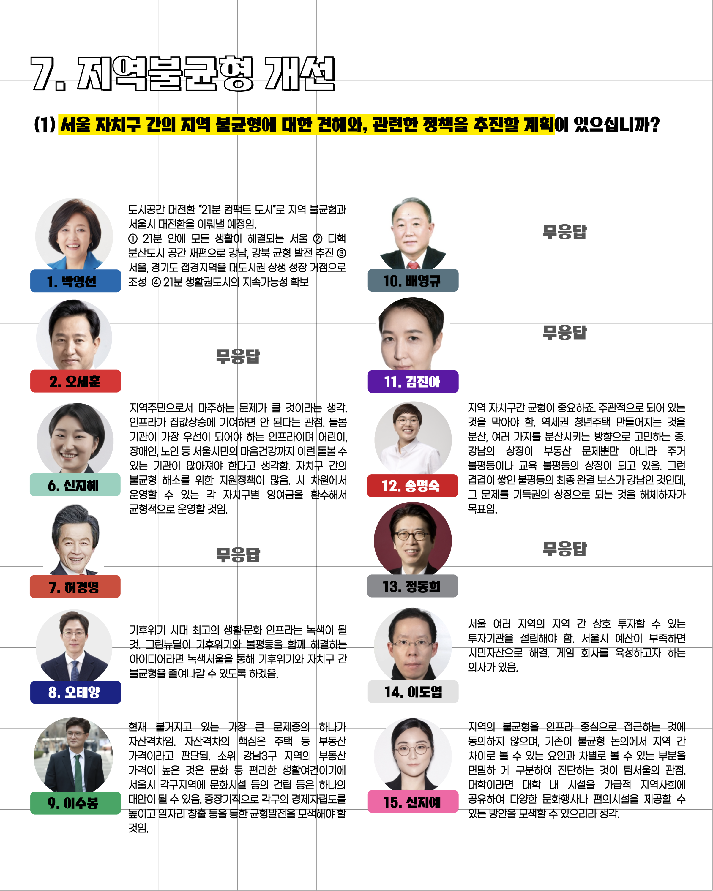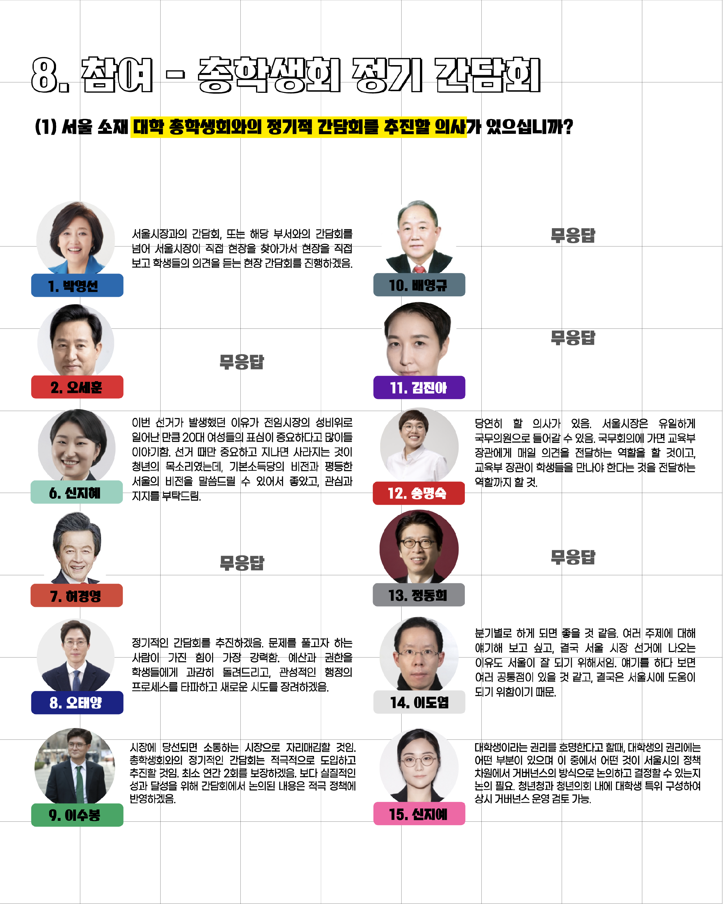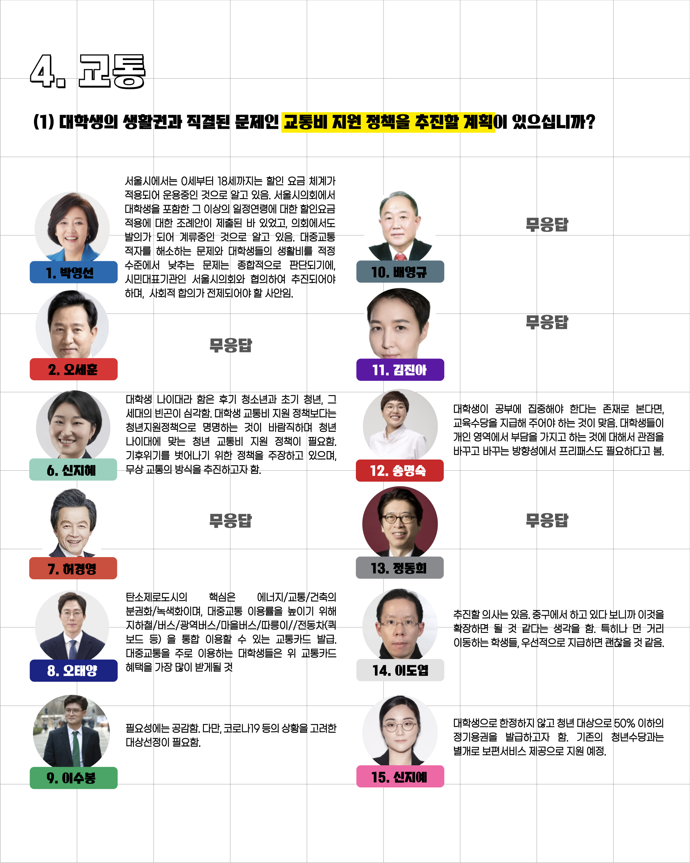 2-2탄. 서울시장후보자 간담회: 교통, 취업, 인권/성폭력, 지역불균형, 참여 안녕하세요, 서울과학기술대학교 제37대 Be:ST 총학생회입니다. 오늘부터 서울시장 보궐선거 사전 투표가 실시됩니다. 학우 여러분이 후보자를 더 잘 알고 신중하게 투표권을 행사할 수 있도록, Be:ST 총학생회가 참여한 <서울시장 보궐선거 대응을 위한 특별위원회>에서 그간 진행한 후보자 간담회 내용을 카드뉴스로 전달해드립니다. <서울시장보궐선거 대응을 위한 특별위원회는 지난 3월 3주차부터 4월 1주차까지 15인의 서울시장 후보자들과의 간담회와 서면인터뷰를 진행하였습니다. 4월 1일 기준 7명의 후보자가 회신을 했으며, 서면 답변 및 간담회 내용을 기준으로 인터뷰 결과를 공유드립니다! ?서면답변확인>> http://bit.ly/서울시장후보자_서면답변 ?카드뉴스 내용 본문 ?4.7 서울시장보궐선거, 대학생의 소중한 한 표를 행사합시다! - 서울시장 보궐선거 대응을 위한 특별위원회 (전국대학학생회네트워크, 서울과학기술대학교 총학생회, 성신여자대학교 총학생회 비상대책위원회, 홍익대학교 서울캠퍼스 총학생회) -
