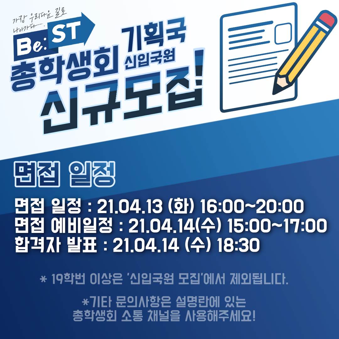 ?지원 자격 ?면접 일정 : 2021. 04. 13 (화) 16:00 - 20:00 *19학번 이상은 '신입국원 모집'에서 제외됩니다.