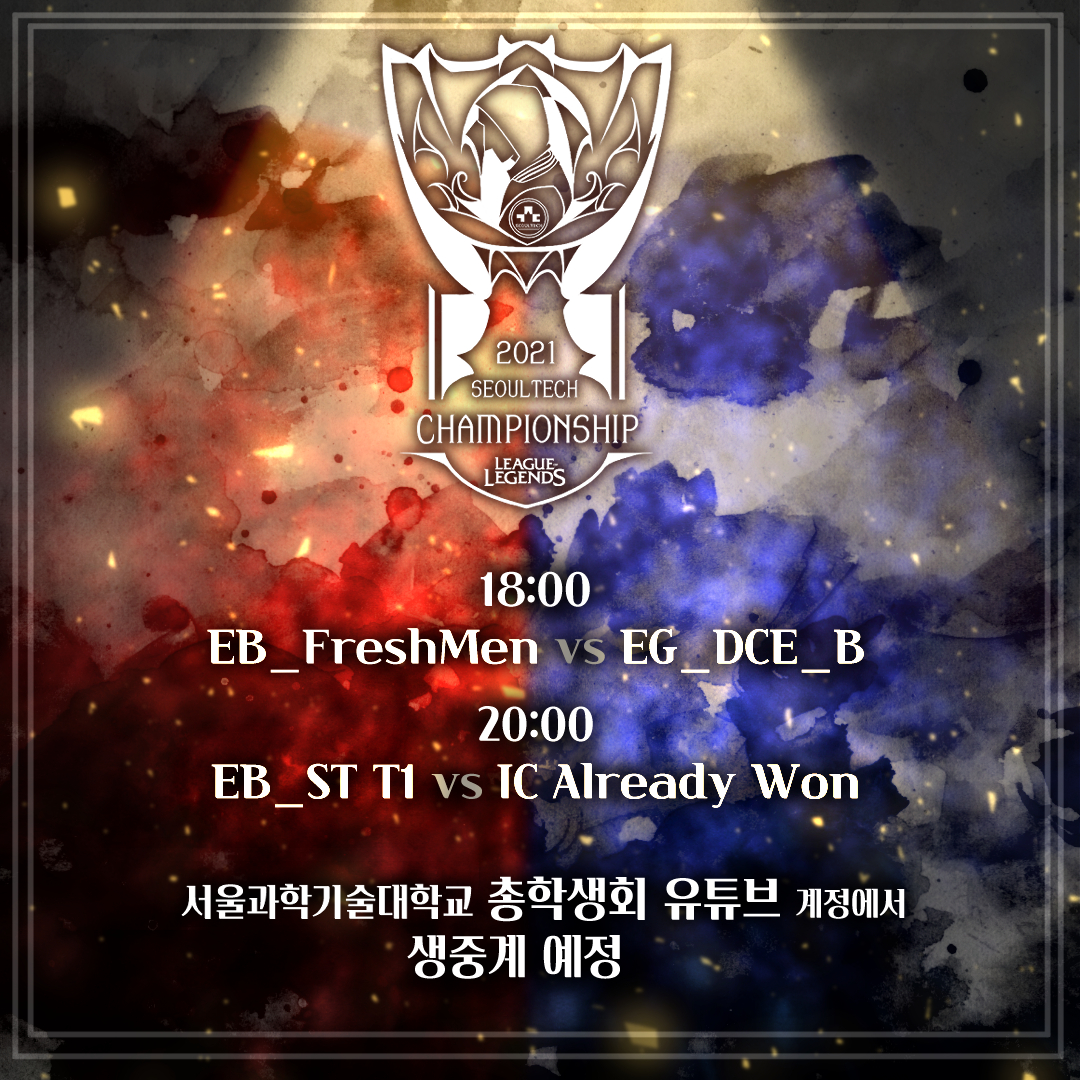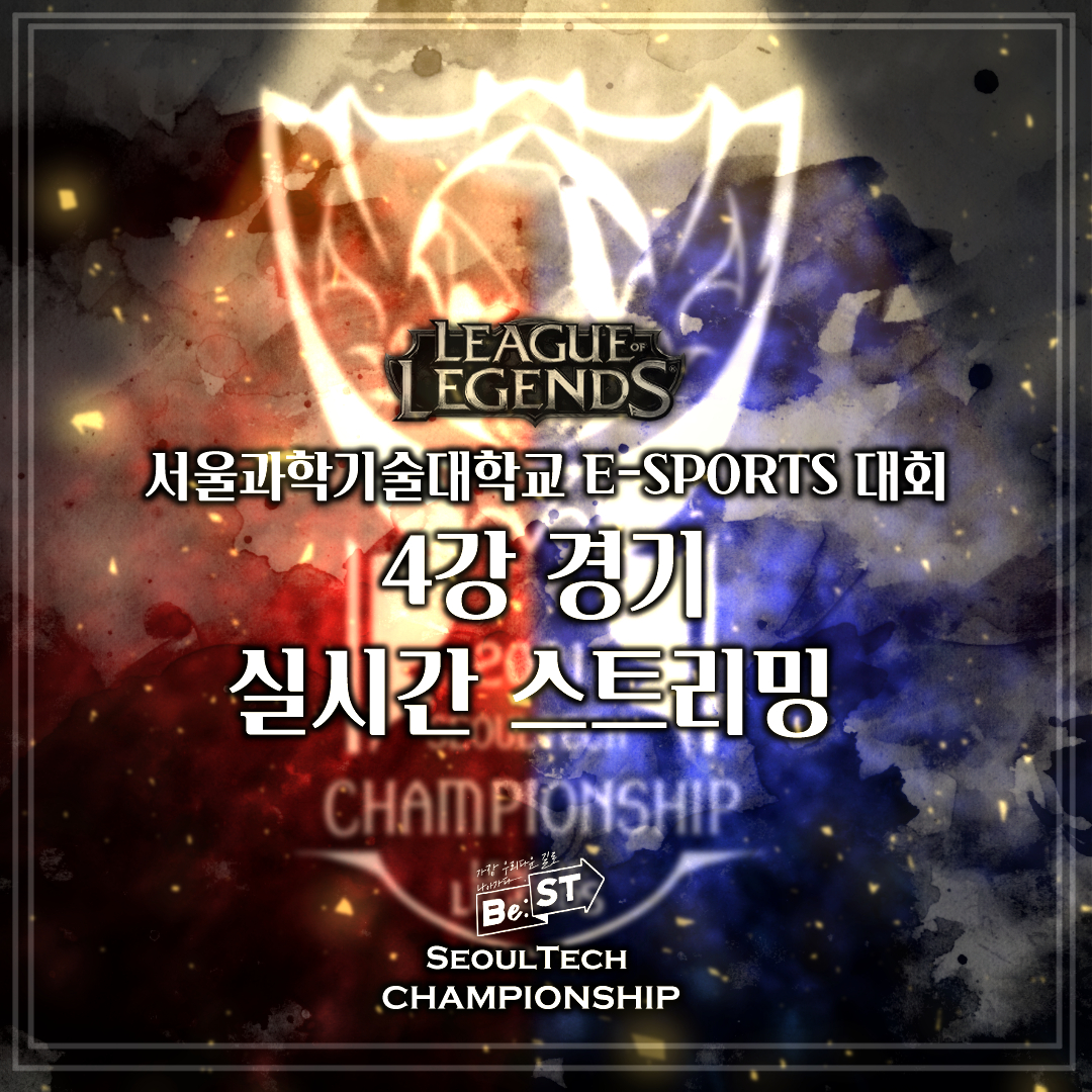 ?준결승 생중계 안내? 안녕하세요, 서울과학기술대학교 제37대 Be:ST 총학생회입니다. 5월 7일 금요일 펼쳐지는 SeoulTech Championship League of Legends 종목 준결승전 경기가 서울과학기술대학교 STBS와 함께 생중계로 진행될 예정입니다. 학우 여러분들의 많은 관심 부탁드립니다. ☑ 준결승전 Match Up ✔ 제1경기 (18:30) ✔ 제2경기 (20:00) *제1경기 진행 상황에 따라 제2경기 중계가 다소 늦어질 수 있습니다.  |