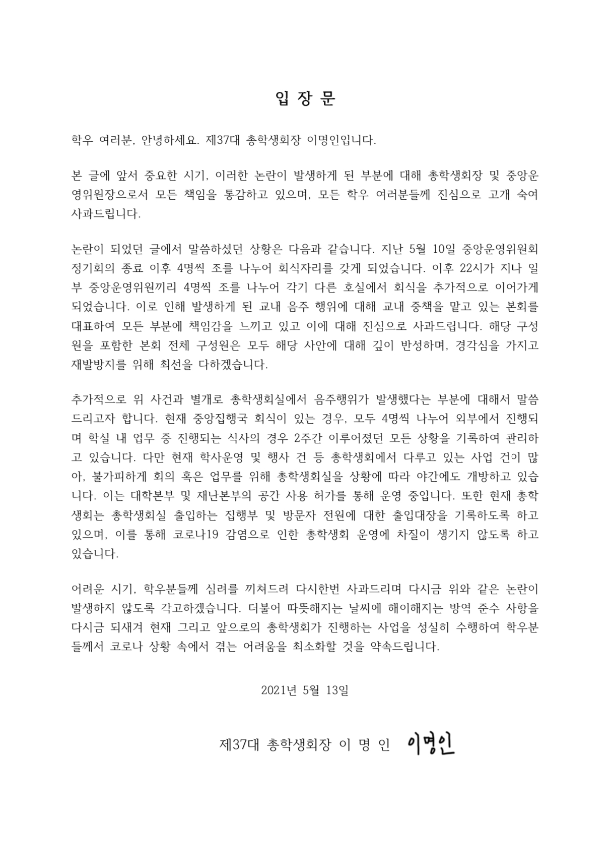입 장 문 학우 여러분, 안녕하세요. 제37대 총학생회장 이명인입니다. 본 글에 앞서 중요한 시기, 이러한 논란이 발생하게 된 부분에 대해 총학생회장 및 중앙운영위원장으로서 스스로 모든 책임을 통감하고 있으며, 모든 학우 여러분들께 진심으로 고개 숙여 사과드립니다. 논란이 되었던 글에서 말씀하셨던 상황은 5월 10일 중앙운영위원회 정기회의 종료 이후 4명씩 조를 나누어 회식자리를 갖게 되었습니다. 이후 일부 중앙운영위원끼리 4명씩 나누어 총학생회실에서 회식을 추가적으로 이어가게 되었습니다. 이로 인해 발생하게 된 교내 음주 행위에 대해 교내 중책을 맡고 있는 본회를 대표하여 모든 부분에 책임감을 느끼고 있고 이에 대해 진심으로 사과드립니다. 또한 본 사안에 대해 엄중하게 논의를 가졌고, 해당 구성원을 포함한 본회 전체 구성원 모두 깊이 반성하여 경각심을 가지고 재발방지를 위해 최선을 다하겠습니다. 추가적으로 위 사건과 별개로 총학생회실에서 음주행위가 발생했다는 부분에 대해서 말씀드리고자 합니다. 현재 중앙집행국 회식이 있는 경우, 모두 4명씩 나누어 외부에서 진행되며 학실 내 업무 중 진행되는 식사의 경우 2주간 이루어졌던 모든 상황을 기록하여 관리하고 있습니다. 다만 현재 학사운영 및 행사건 등 총학생회에서 다루고 있는 사업 건이 많아, 불가피하게 회의 혹은 업무를 위해 총학생회실을 상황에 따라 야간에도 개방하고 있습니다. 이는 대학본부 및 재난본부의 공간 사용 허가를 통해 운영 중입니다. 또한 현재 총학생회는 총학생회실 출입하는 집행부 및 방문자 전원에 대한 출입대장을 기록하도록 하고 있으며, 이를 통해 코로나19 감염으로 인한 총학생회 운영에 차질이 생기지 않도록 하고 있습니다. 어려운 시기, 학우분들께 심려를 끼쳐드려 다시한번 사과드리며 다시금 위와 같은 논란이 발생하지 않도록 각고하겠습니다. 더불어 따뜻해지는 날씨에 해이해지는 방역 준수 사항을 다시금 되새겨 현재 그리고 앞으로의 총학생회가 진행하는 사업을 성실히 수행하여 학우분들께서 코로나 상황 속에서 겪는 어려움을 최소화할 것을 약속드립니다. 2021년 5월 13일                              제37대 총학생회장