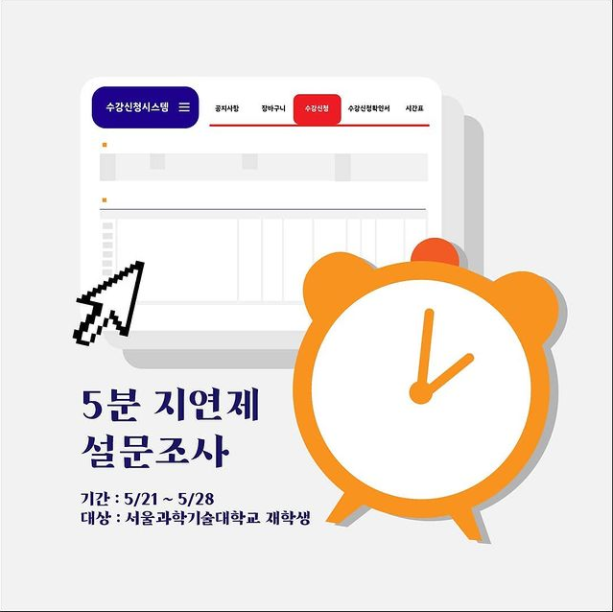 ✔설문 대상: '수강신청 5분지연제'가 시행된 후 수강신청을 해본 경험이 있는 우리대학 학우 ✔설문 기한: 5/21(금) ~ 5/28(금) 자정 ✔설문 링크: https://forms.gle/7TH2CY7YLnkNnz4B6