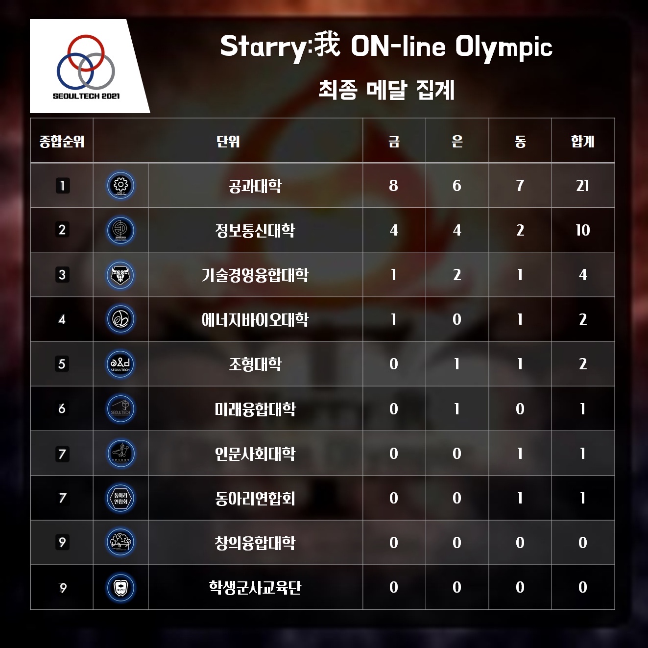 | 제목 | 🏅스테리아 온라인 올림픽 최종결과🏅 | 날짜 | 2021-10-12 | 조회수 | 775 |