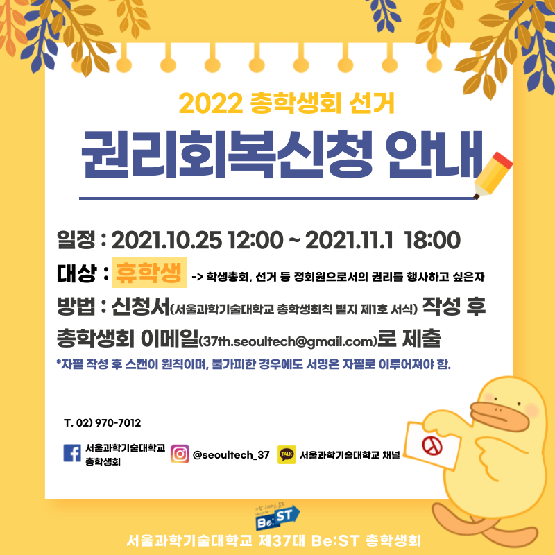총학생회 이메일 (37th.seoultech@gmail.com) 로 제출.