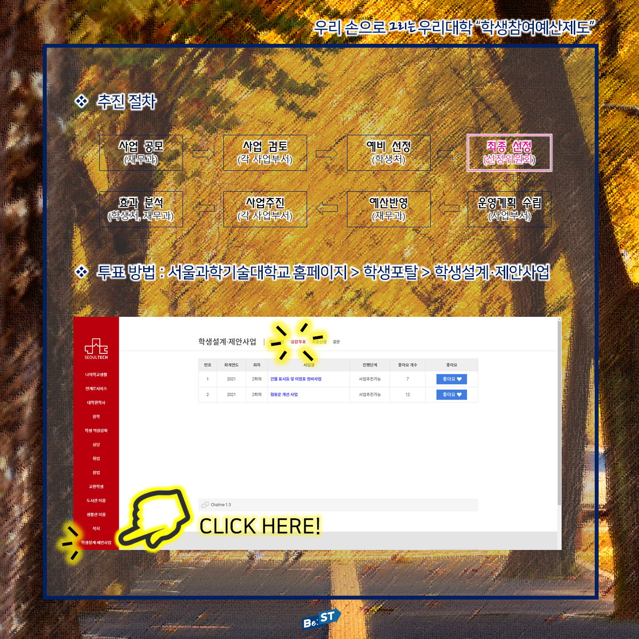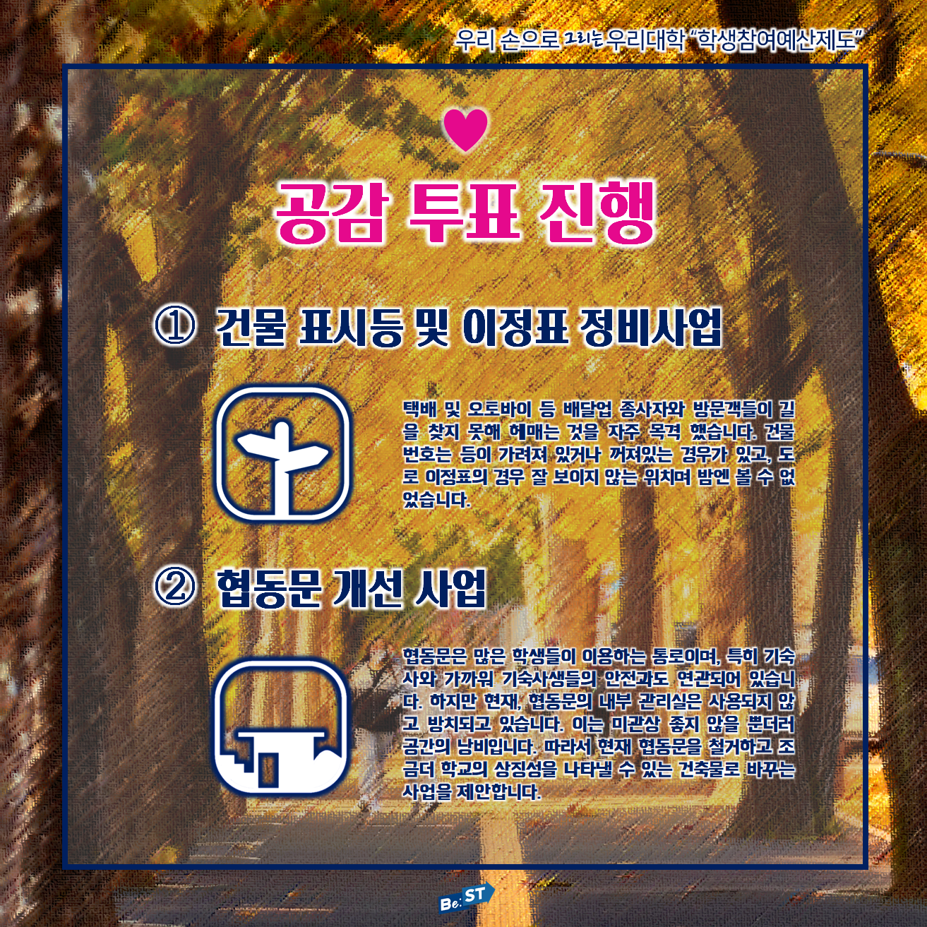 학우 여러분 안녕하세요, 제37대 Be:ST 총학생회입니다. 공약사업으로 야심차게 진행했던 학생참여예산제도가 두 차례 모집기간 동안 총 12개의 사업이 올라왔습니다.