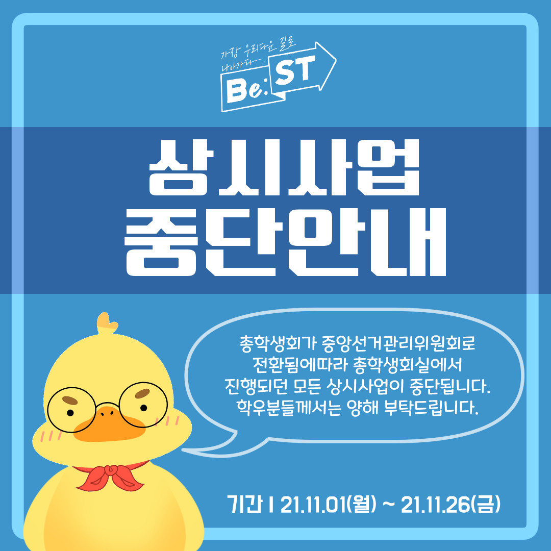 안녕하세요 학우 여러분, 제37대 Be:ST총학생회입니다. 중앙선거관리위원회 체제 운영으로 인한 상시사업 중단에 대하여 안내드립니다.