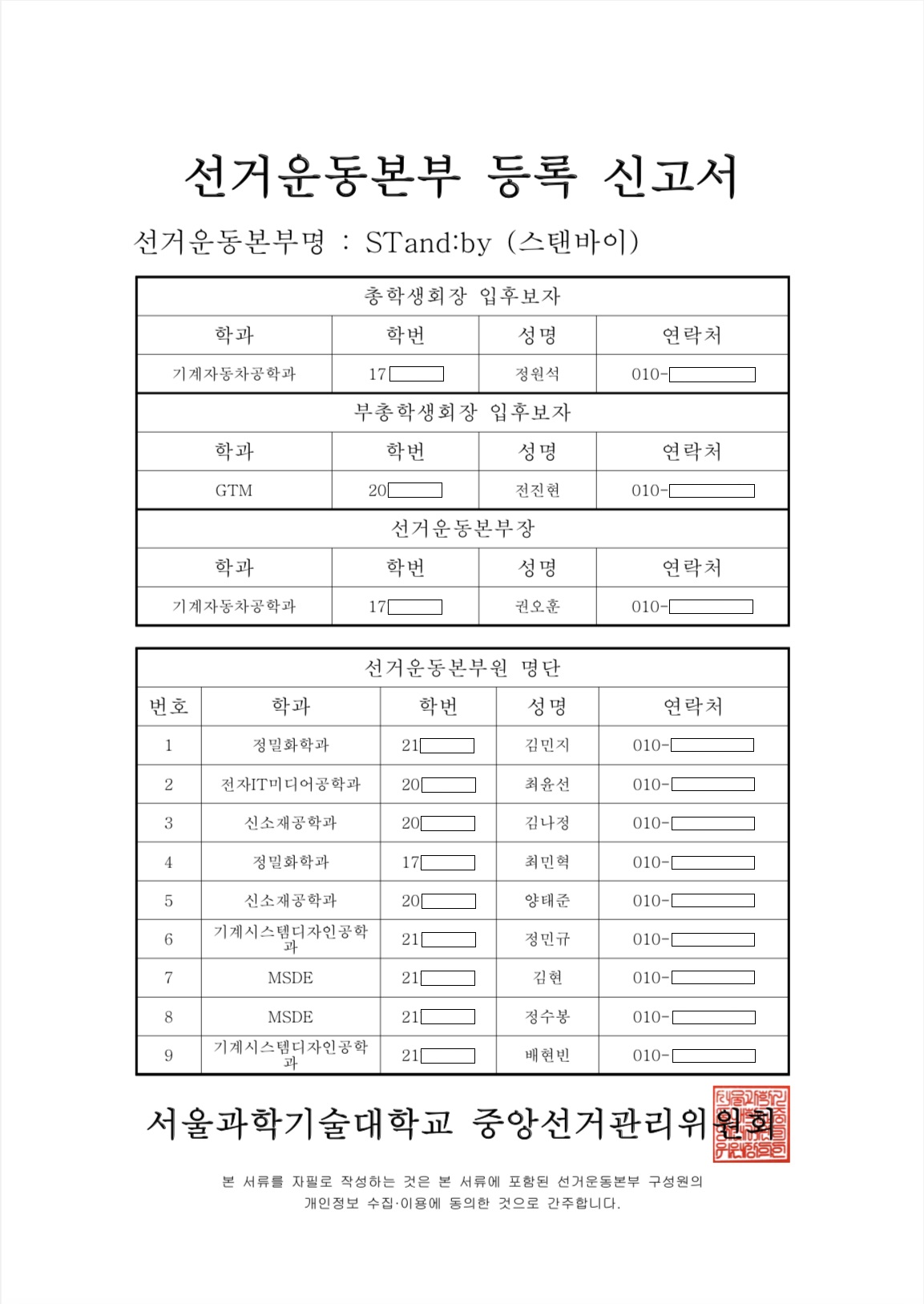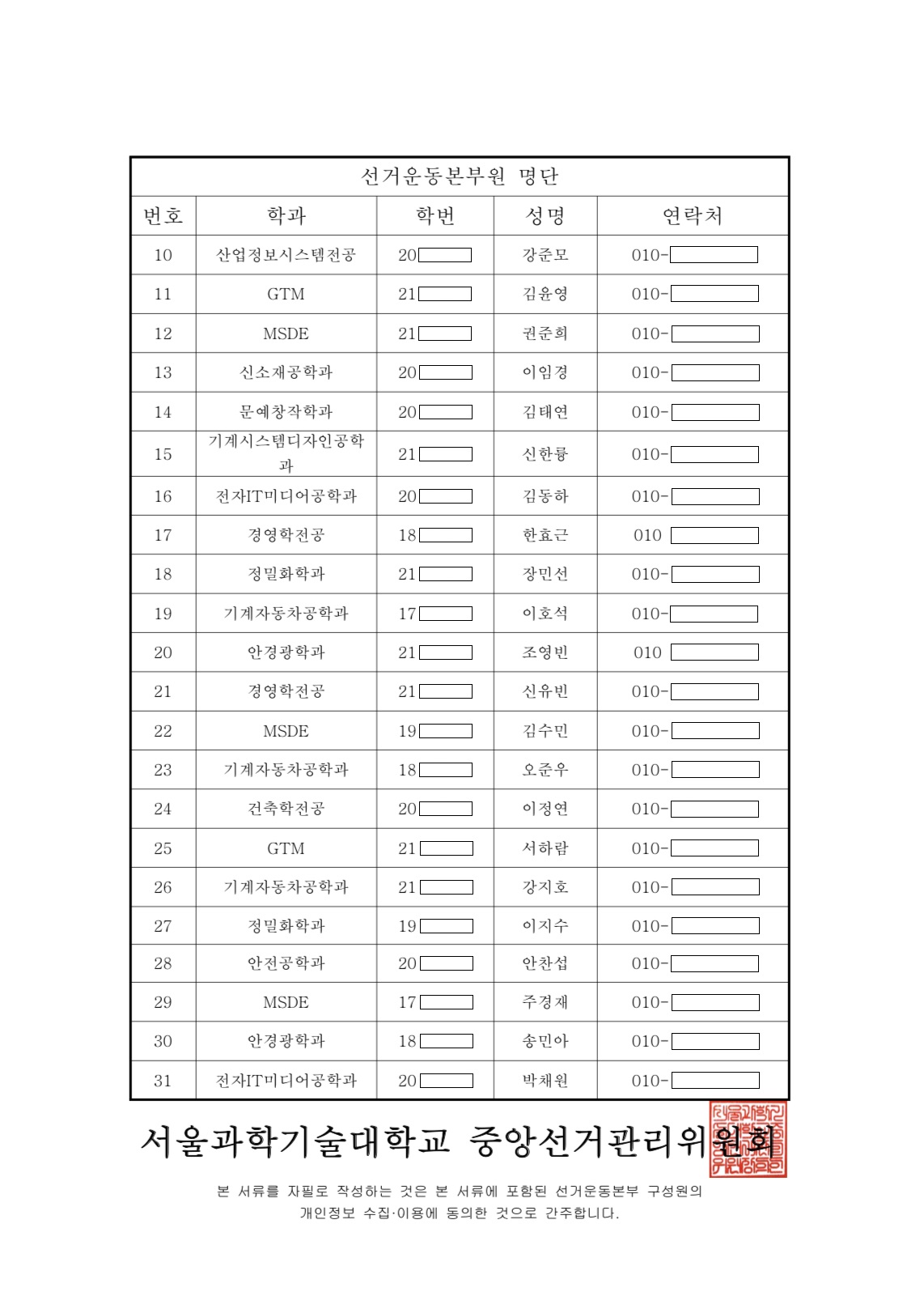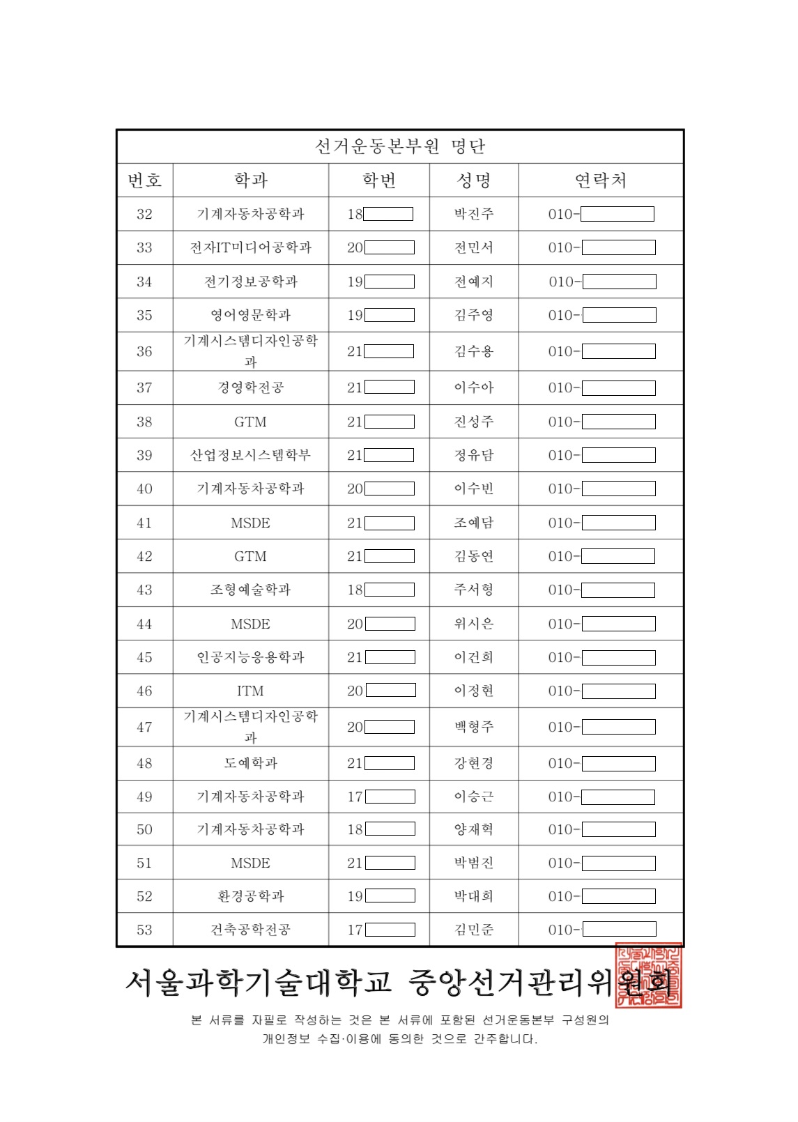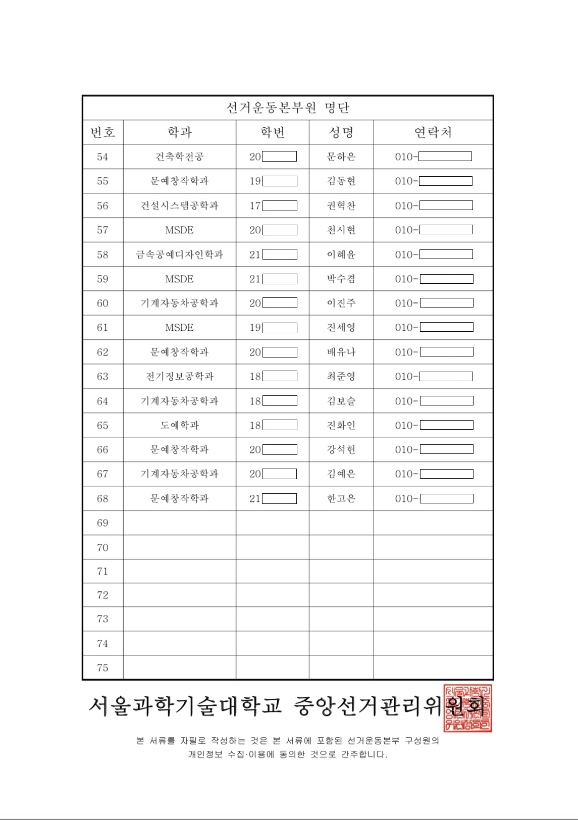 서울과학기술대학교 총학생회 선거운동은 상기 기재된 인원만 진행할 수 있으며,
