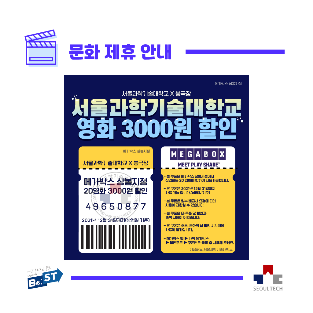 ?총학생회와 함께 하는 문화 제휴 안내? 안녕하세요, 제37대 Be:ST 총학생회입니다. Be:ST 총학생회이 상봉 메가박스점과 ?문화 제휴?를 체결했습니다. ? 서울과학기술대학교 X 봉극장 ? ? 제휴 소개 ? 유의사항 코로나와 함께 하는 요즘, 총학생회와 함께하는 문화 제휴가 학우 여러분께 힘이 되기를 바랍니다?! 가장 우리다운 길로 나아가는 Be:ST 총학생회?
