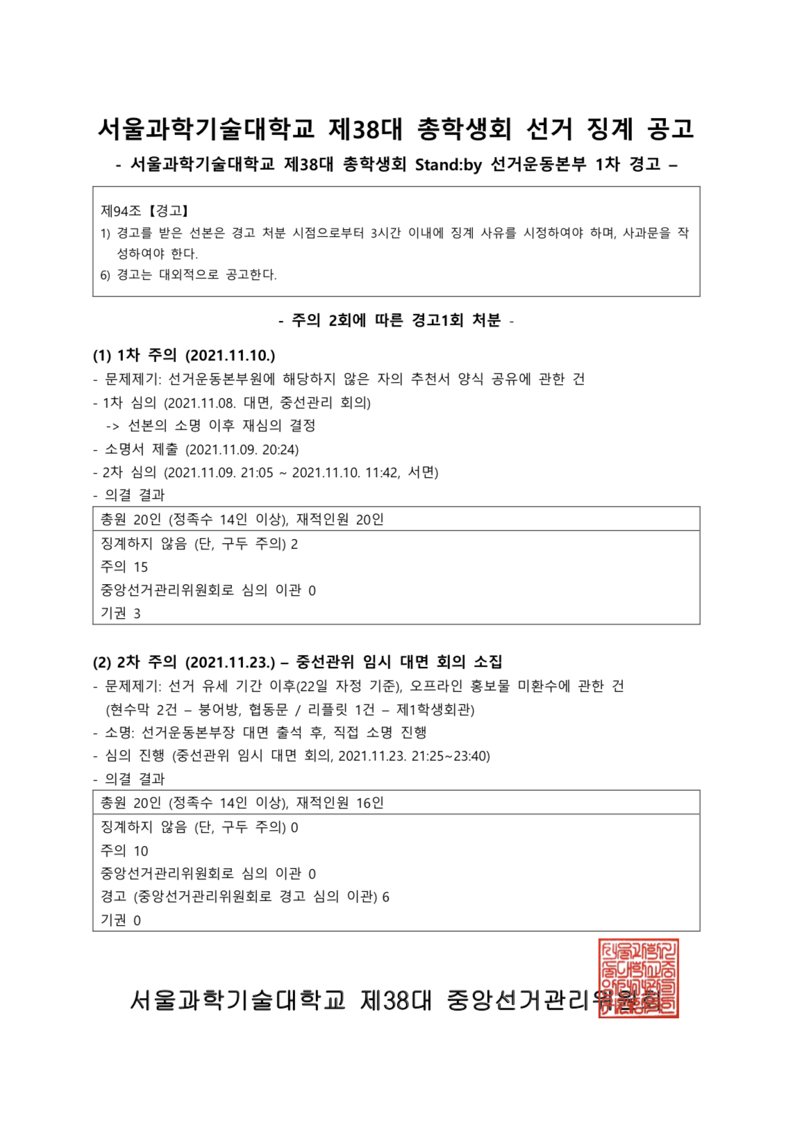 서울과학기술대학교 제38대 총학생회 STand:by 선거운동본부 1차 경고에 대한 공고를 게시합니다.